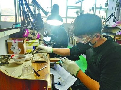 在珠寶加工工作室里,一排排機器后面,大學生們正低著頭專心致志加工玉石,有的在雕刻,有的在打磨,其中還有8位來自緬甸的留學生。緬甸留學生相猛江用不太熟練的漢語對記者說:"我來了7個月,正在學習雕刻玉馬。"